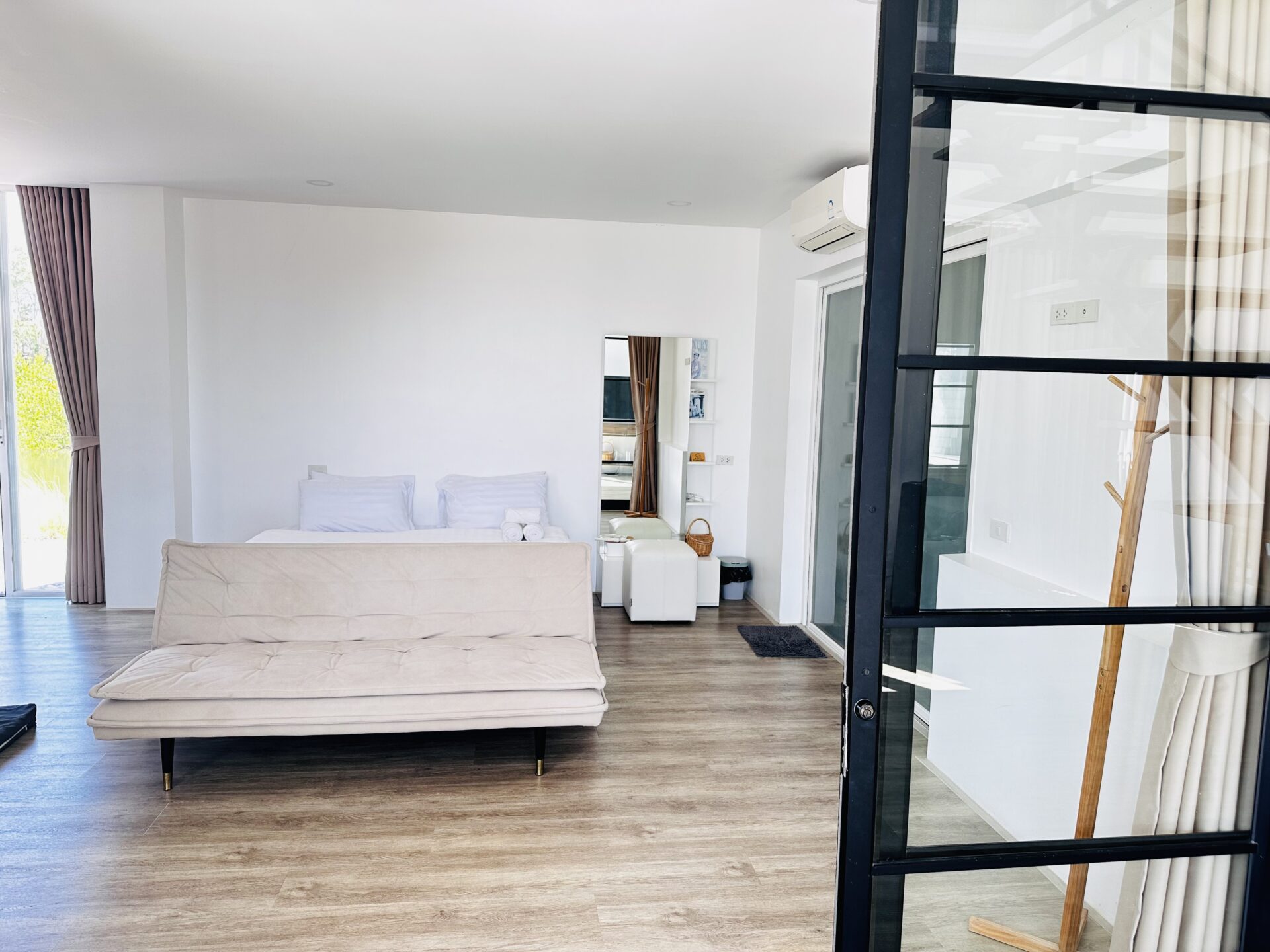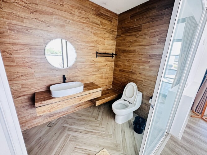 - เตียง 6 ฟุต 1 เตียง + ห้องน้ำในตัว