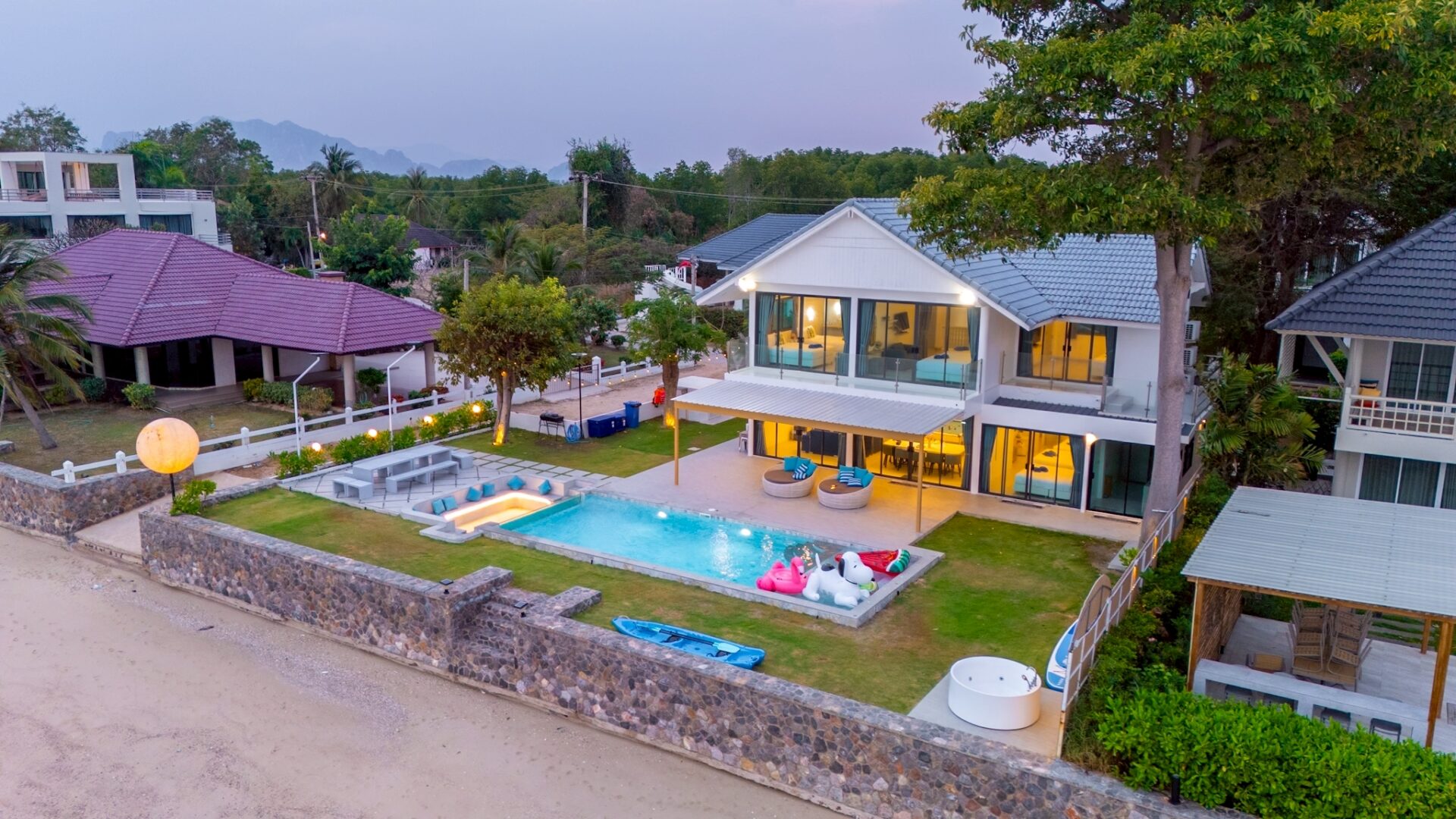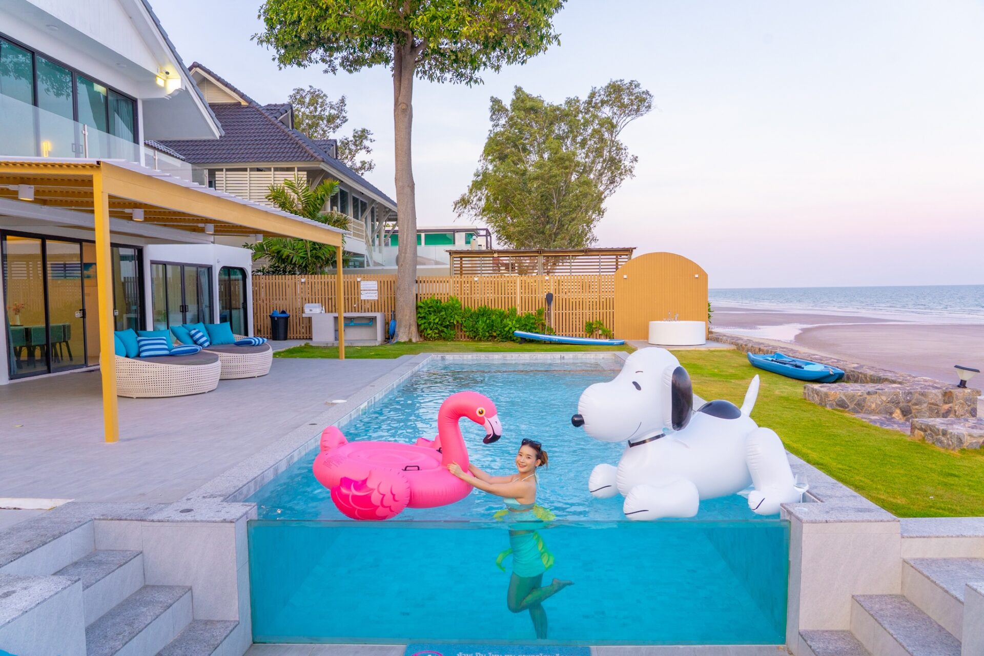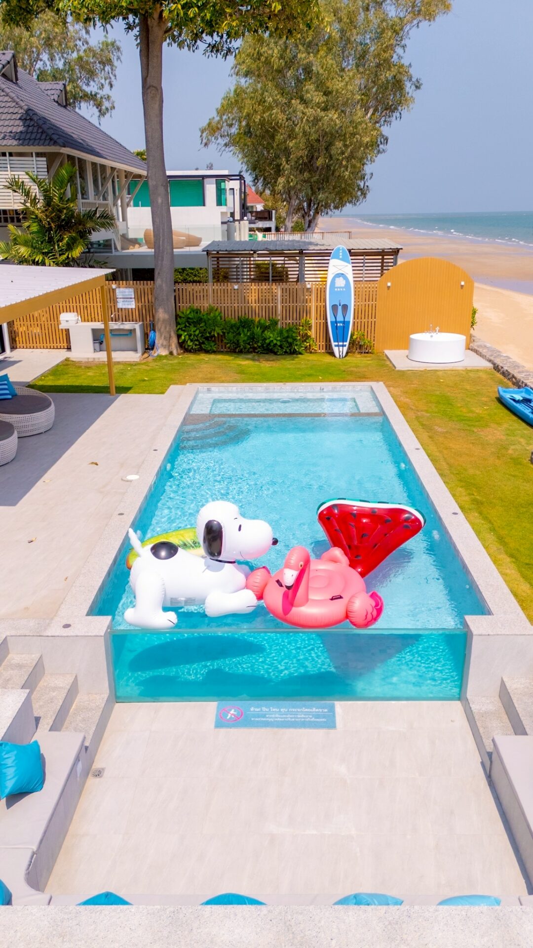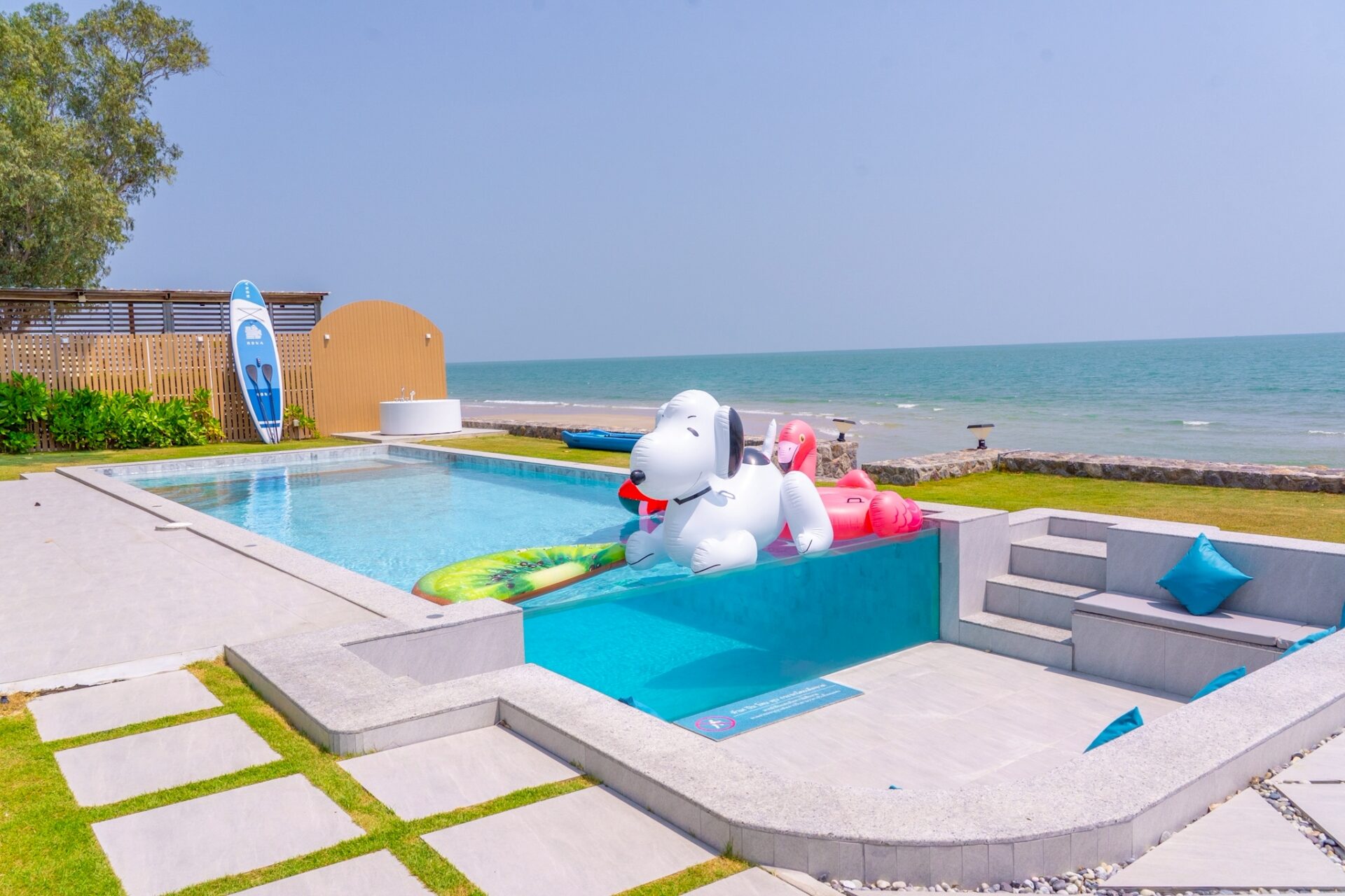 - There is a beach in front of the villa. The tide follows seasonal patterns, and during low tide, the beach will be accessible.